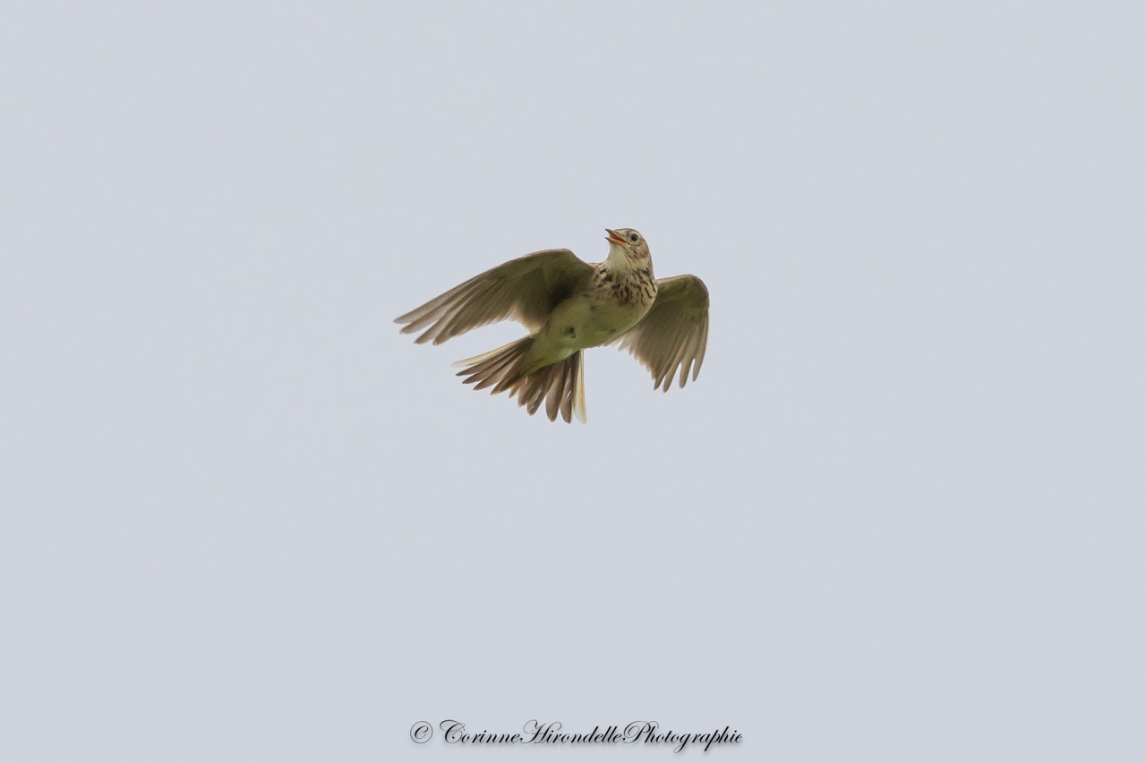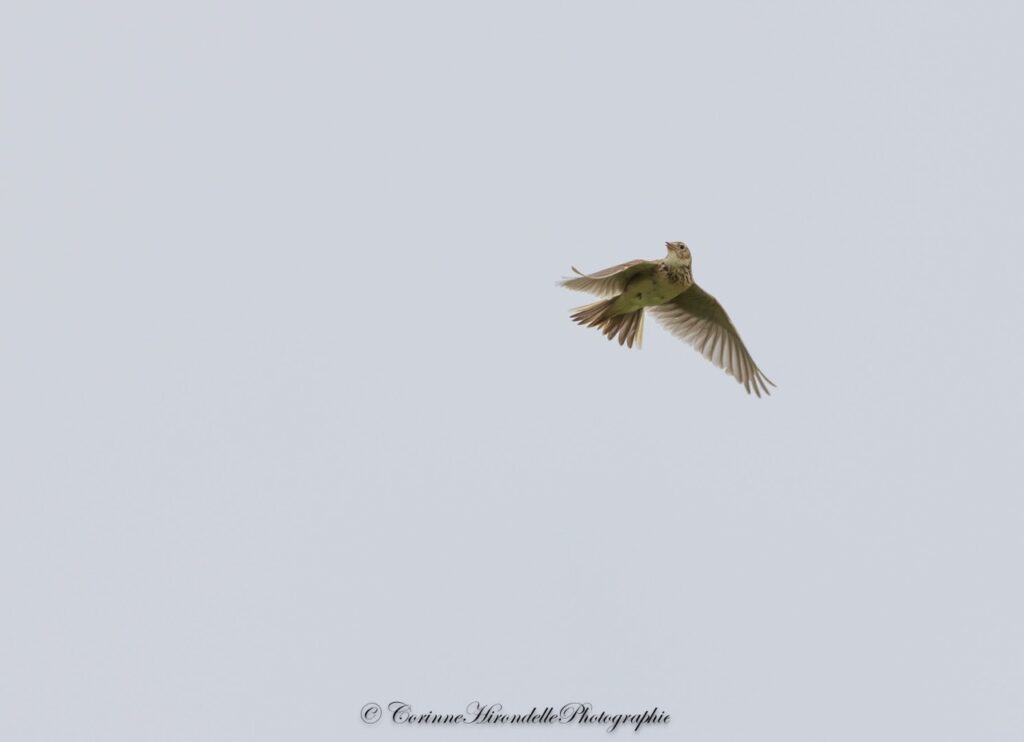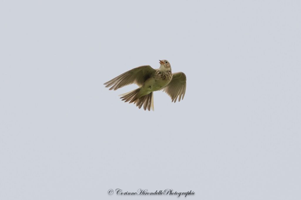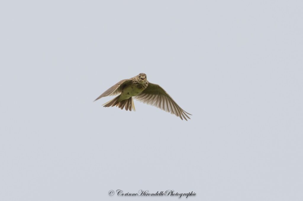 Taille 18,5 cm. L’alouette des champs a le bec court, le plastron est de couleur fauve strié. Le bord des alaires et de la queue sont blanc. Elle a un huppe courte que l’on voit une fois que l’on peut l’observer au sol, ce qui est rare. Le sourcil est pâle et la face ocre est unie. On l’entend chanter quand elle est très haut dans le ciel et en vol stationnaire.