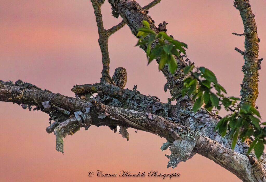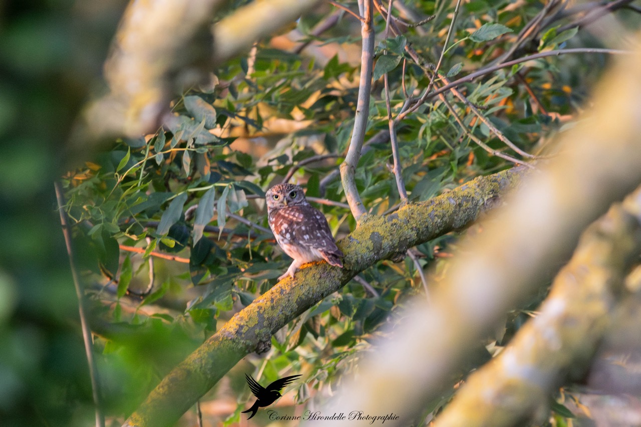 Taille 23 à 27 cm. La chevêche d’Athéna un grosse tête ronde avec de long sourcils blancs. Ses yeux sont jaunes ainsi que le bec. Le dessus est brun strié de tâches rondes et blanches. Le dessous est plus clair et avec des stries marronnées. Elle a de hautes pattes et une queue courte. Elle chasse aussi bien le jour que la nuit.